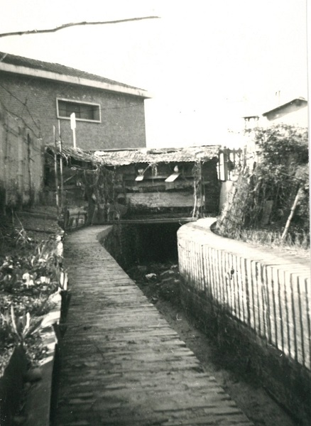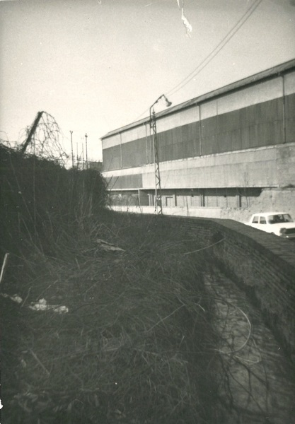 Fig. 2. La Canaletta delle Lame a monte del sottopasso di via Zanardi, a fianco si nota il capannone, poi concessionario OPEL, che storicamente stava sul lato opposto della via, oggi sostituito da un supermercato, foto Archivio Canali di Bologna, post Seconda Guerra Mondiale.