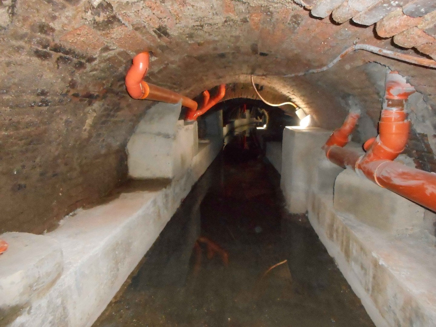 Il Canale di Savena, una volta entrato all’interno di quella che un tempo era la terza cerchia muraria della città, si divide in un fitto reticolo di condotti secondari. Tra questi il Condotto Castiglione che entra in città sottopassando l’omonima porta e continua poi fino all’incrocio con via Orfeo ove, fino alla metà dell’Ottocento, si biforcava in due condotti: un ramo proseguiva per via Castiglione, l’altro, detto Fiaccacollo per la notevole pendenza, seguiva l’andamento di via Rialto in passato identificata con lo stesso nome del canale (fig. 1). Un’altra derivazione del ramo di Castiglione si inoltra tutt’ora sotto l’isolato compreso tra le vie Cartolerie e Castellata (fig. 2) e dopo aver intersecato via Santo Stefano prosegue sotto l’area compresa tra via Guerrazzi e vicolo Posterla. Proprio questo tratto compreso tra via Castiglione e Santo Stefano è stato oggetto di un progetto di risanamento ambientale completato nel 2017. L’ingresso al condotto durante i lavori è stato possibile grazie ad un accesso collocato in corrispondenza di questo numero civico in via Castiglione, come si può vedere dal video di Galileo Ingegneria con l’analisi e la progettazione di sistemi di recupero in ambiente confinato specifico per un condotto sotterraneo. Dopo il rilevamento degli scarichi reflui irregolari provenienti dalle unità immobiliari, adiacenti al condotto, è stato predisposto l’intervento che si è dovuto adattare alle diverse dimensioni del manufatto di copertura. Nonostante tutte le difficoltà, dovute agli spazi sotterranei, sono stati realizzati il piano di scorrimento delle acque in cemento e gli allacci verticali di numerosi tubi di scarico immessi nei collettori orizzontali principali collegati al depuratore (fig. 3).