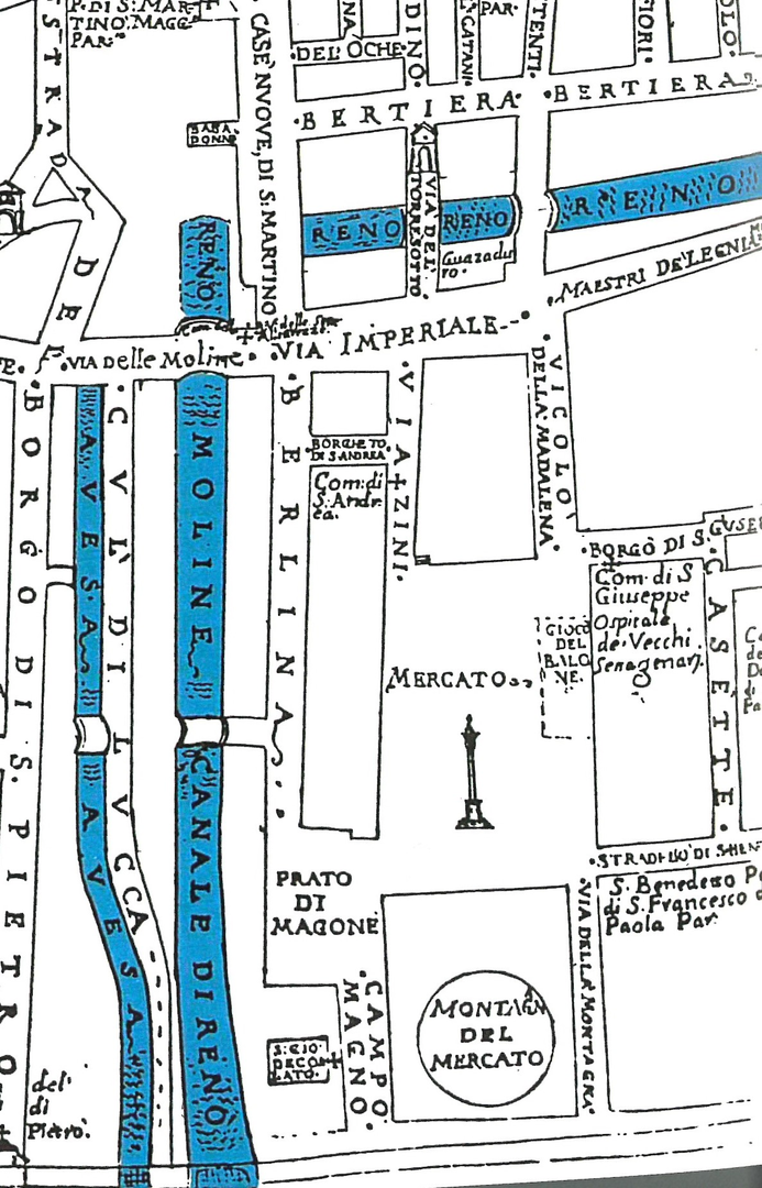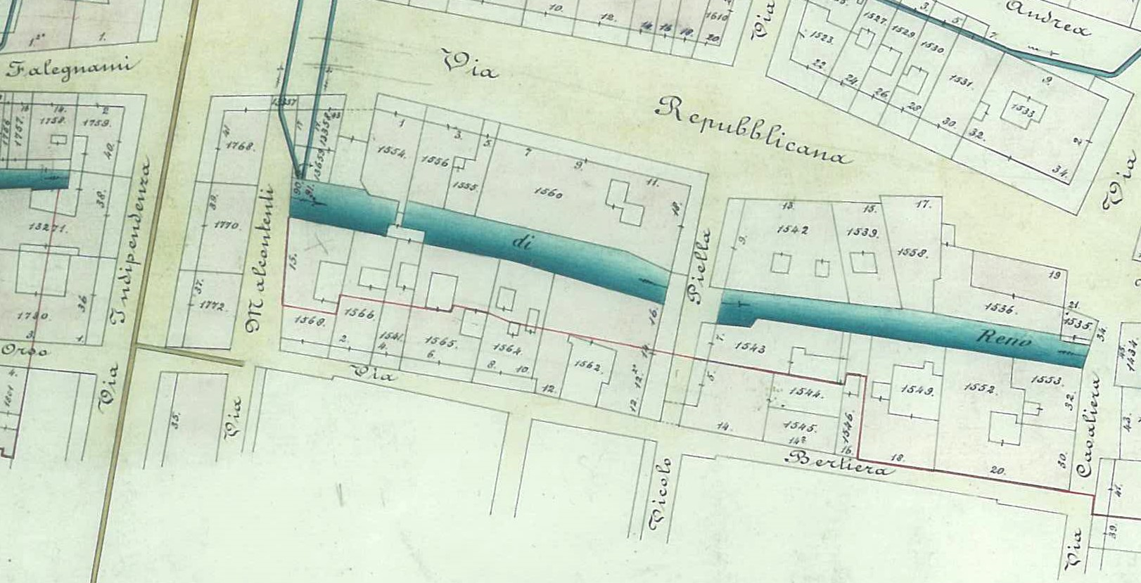 Di tali guazzatoi in città ne rimane testimonianza la discesa qui davanti (denominata ai tempi Guazaduro come da fig. 1) verso il canale, posta all’angolo tra via Augusto Righi (in passato via Imperiale e poi via Repubblicana come da fig. 2) e via Malcontenti.