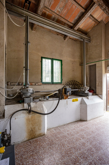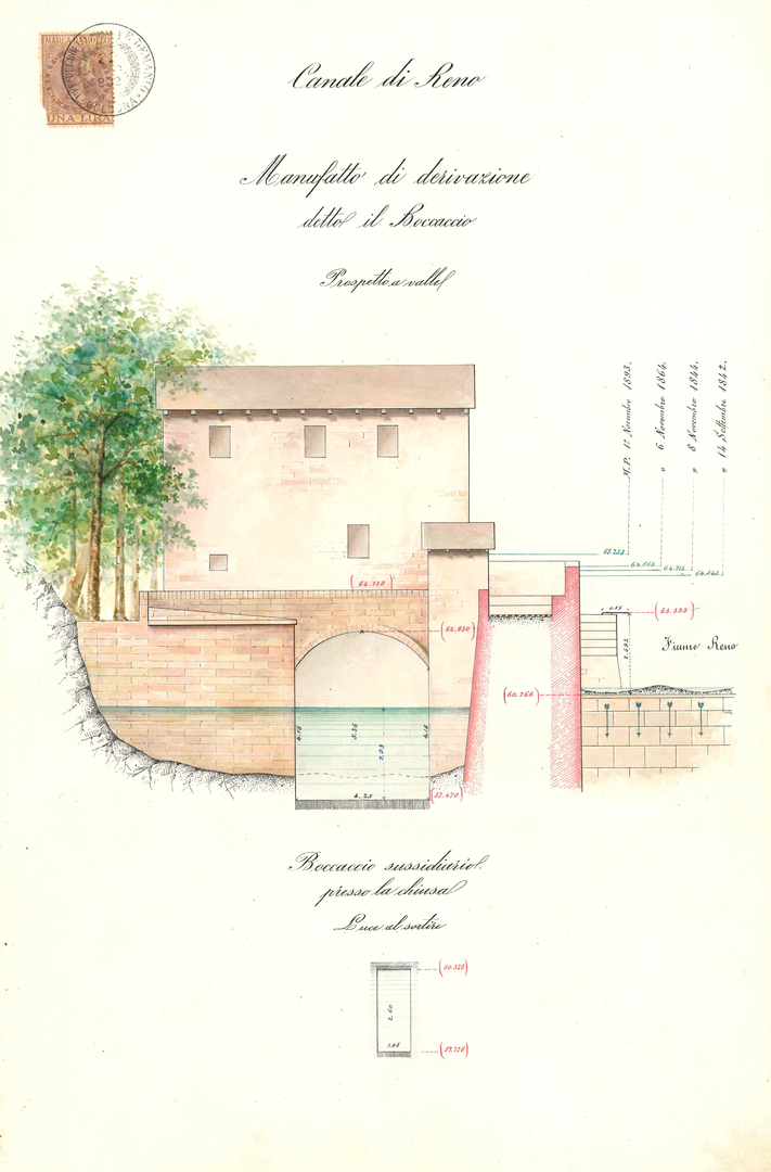 La costruzione che vedete in questo punto ospita i meccanismi (Fig. 1) che permettono di regolare la paratoia del Boccaccio (Fig. 2) che potremmo definire come la porta d’ingresso al canale per l’acqua del fiume Reno. Da questo punto, anche detto incile, ha così inizio il Canale di Reno, che da Casalecchio porta acqua alla città di Bologna il cui centro storico è situato a circa sei chilometri di distanza da qui.