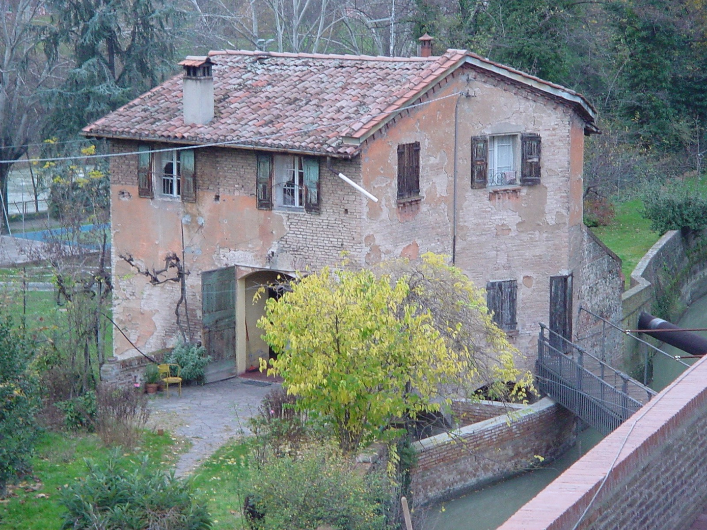Il singolare fabbricato (fig. 1) che si scorge oltre a questo cancello è costruito su un sentiero a cavallo tra il fiume Reno e il canale da esso derivato (Canale di Reno). La graziosa abitazione funziona ancora oggi come una “macchina idraulica”. All’interno della costruzione è infatti collocato lo strumento per la regolazione della paratoia del Paraporto Scaletta, ovvero un’apertura posta più in basso rispetto al piano di scorrimento del condotto artificiale, usata per scaricare dai sedimenti il fondo del Canale di Reno, il cui punto di derivazione è situato poco lontano da qui presso la Chiusa di Casalecchio.