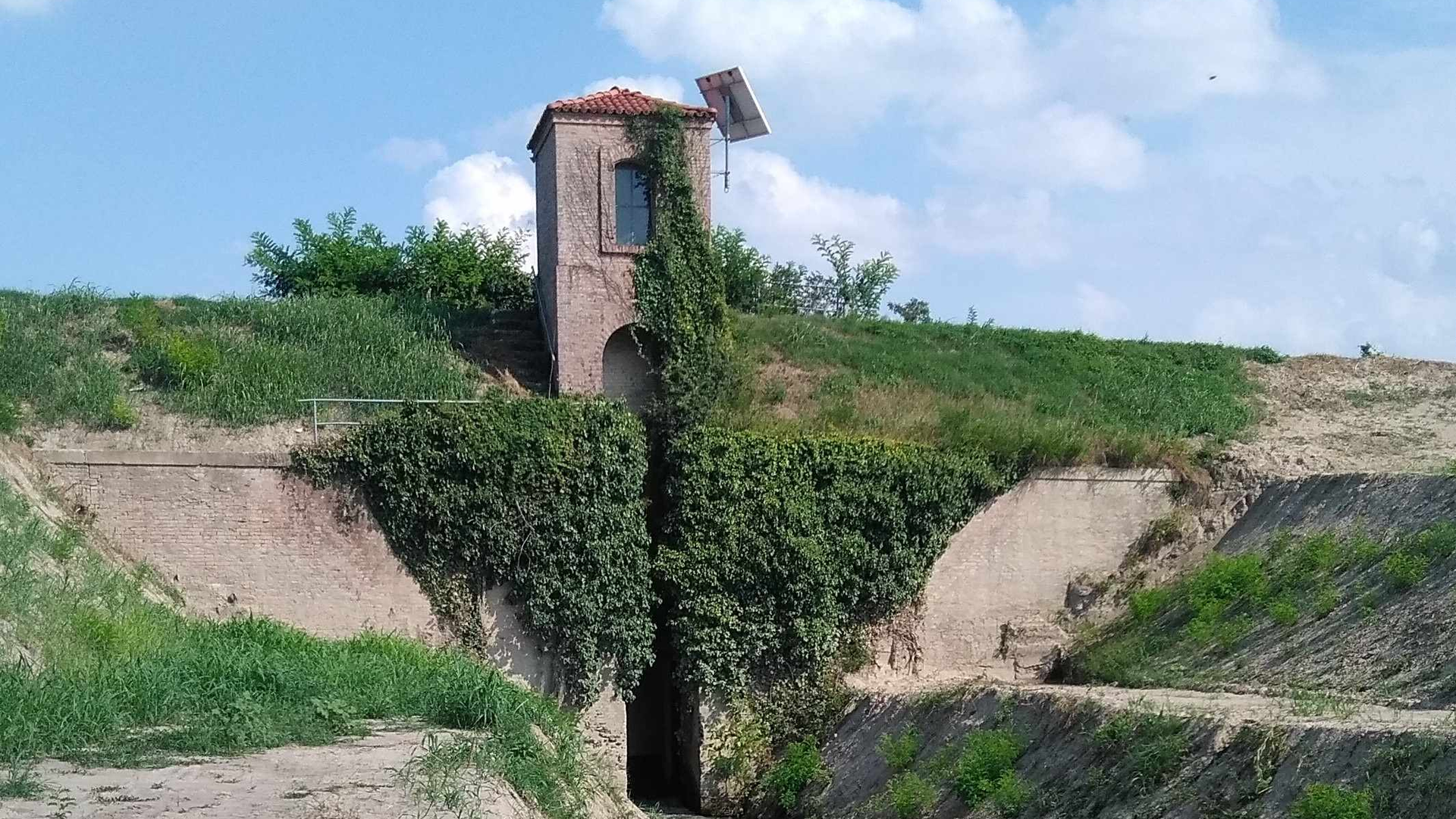 Fig. 1. La piccola costruzione in mattoni sull’argine del fiume a Trebbo di Reno nel punto d’intersezione con la Canaletta Ghisiliera, foto Archivio Canali di Bologna, 2020.