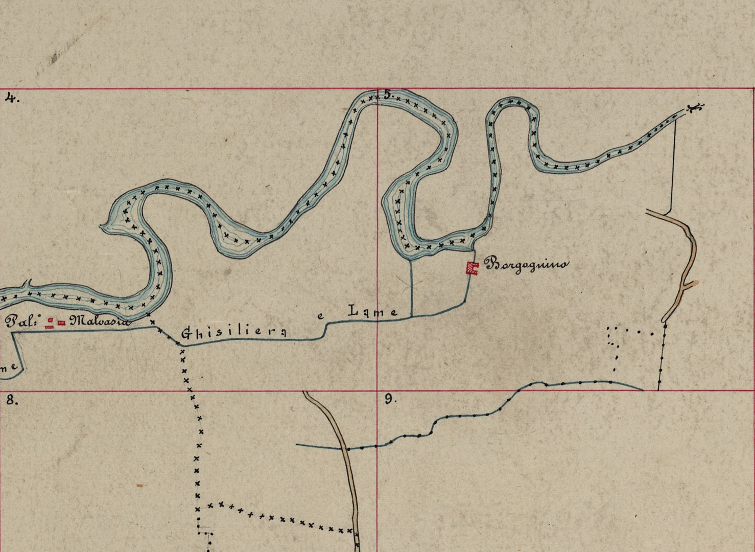Dal dettaglio del quadro d’unione della pianta generale dei terreni che si irrigano colle acque derivate dal canale di Reno superiormente alla Grada e dalle canalette Ghisiliera e delle Lame (fig. 2) si nota come un tempo il corso del fiume in questo punto fosse diverso e avesse un caratteristico andamento “meandriforme” dall’ampia ansa sinuosa che sfiorava il Molino Borgognino, la cui costruzione è ancora visibile a pochi metri da qui. Da un attuale screenshot (fig. 3) preso da Google Earth risulta evidente come il percorso del fiume sia cambiato nel corso del tempo. Non a caso un cartiglio apposto sull’edificio ricorda che questo paraporto sulla Ghisiliera venne realizzato nel 1931 in occasione della rettifica dell’alveo del Reno (fig. 4).