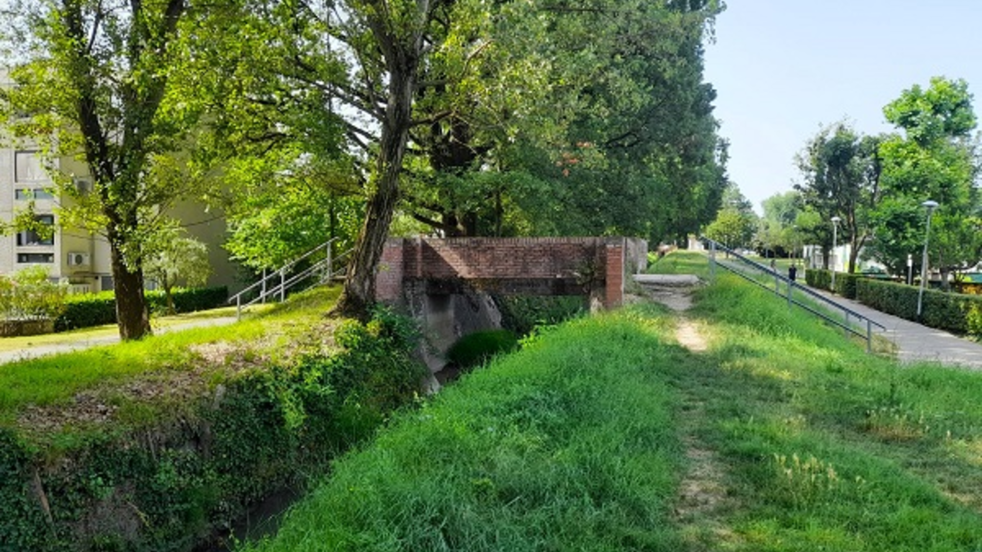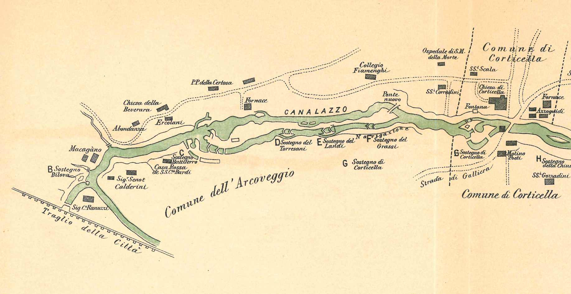La Canaletta Ghisiliera è una derivazione del Canale di Reno che attraversa una vasta area a Nord Ovest di Bologna, interessando i territori di Bertalia e del Trebbo, per confluire nel fiume Reno dopo km 10,43. Il nome deriva dalla famiglia Ghisilieri, proprietaria di terreni agricoli fuori Porta San Felice. Il punto di derivazione 1, non più visibile dopo la copertura del Canale di Reno lungo via Sabotino, si trovava presso l’antico Ponte degli Stecchi, a monte dell’intersezione del torrente Ravone 2 con il Canale di Reno. I tracciati della Ghisiliera e del Ravone si sviluppano paralleli verso Nord prima di sottopassare la via Emilia, nel punto ove si trovava l’Osteria del Chiù 3, per proseguire verso Ovest affiancando via del Chiù 4. Nel primo tratto fu costruito il Molino Piletta, 5 attivo fino al 1987 con il nome di Molino Vancini. Attualmente il Ravone e la Ghisiliera scorrono paralleli a lato di via del Chiù, costeggiando i Prati di Caprara 6. Fin dal 1473 fu concesso a Francesco Ghisilieri di utilizzare l’acqua del Ravone e della canaletta per alimentare il Mulino Ghisilieri o di Ravone 7 , attivo fino al 1990 con il nome di Molino Lazzari. Nel 1997 l’edificio fu espropriato dal Comune per completare la circonvallazione Sud-Ovest. Prima della demolizione furono recuperati il quadro dei comandi elettrici e la ruota idraulica orizzontale in ferro qui esposti. Oltre il Molino di Ravone la Ghisiliera si dirige a Nord seguendo via della Volta, ricevendo poi la canaletta delle Lame 8; superata la Chiesa di San Martino di Bertalia 9 prosegue fino all’ex Molino di Pescarola 10 (attivo fino al 1952), corrispondente al civico 44 di via Selva di Pescarola. Il mulino era stato costruito all’inizio del sec. XVI da Giovanni II Bentivoglio, poi passò alla famiglia Malvasia. Prima di confluire nel Reno la Ghisiliera serviva il Molino Borgognino o di San Guglielmo 11 (attivo fino al 1955), costruito nel 1525 da Ercole Borgognini in società con i Ghisilieri. A poca distanza, prima dello sbocco nel fiume Reno, resta l’antico Paraporto 12 di regolazione delle acque, rimasto in funzione fino alla fine del XIX secolo.