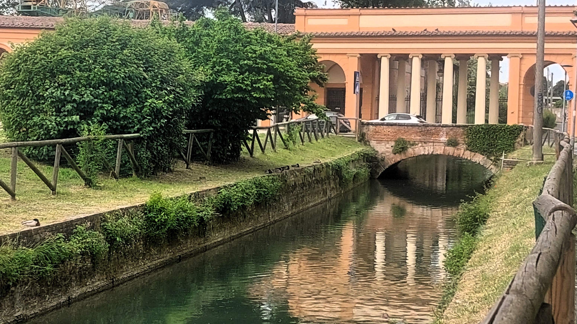 Qui ci troviamo dal Ponte della Certosa e affacciandovi da questo potete vedere un tratto di canale di Reno. Il canale sottopassa il ponte porticato edificato nel 1833-1834 secondo le modifiche dell’architetto Luigi Marchesini, subentrato all’ingegner Ercole Gasperini, cui nel 1811 era stato affidato il progetto del portico per collegare l’ingresso della Certosa con il portico di S. Luca.