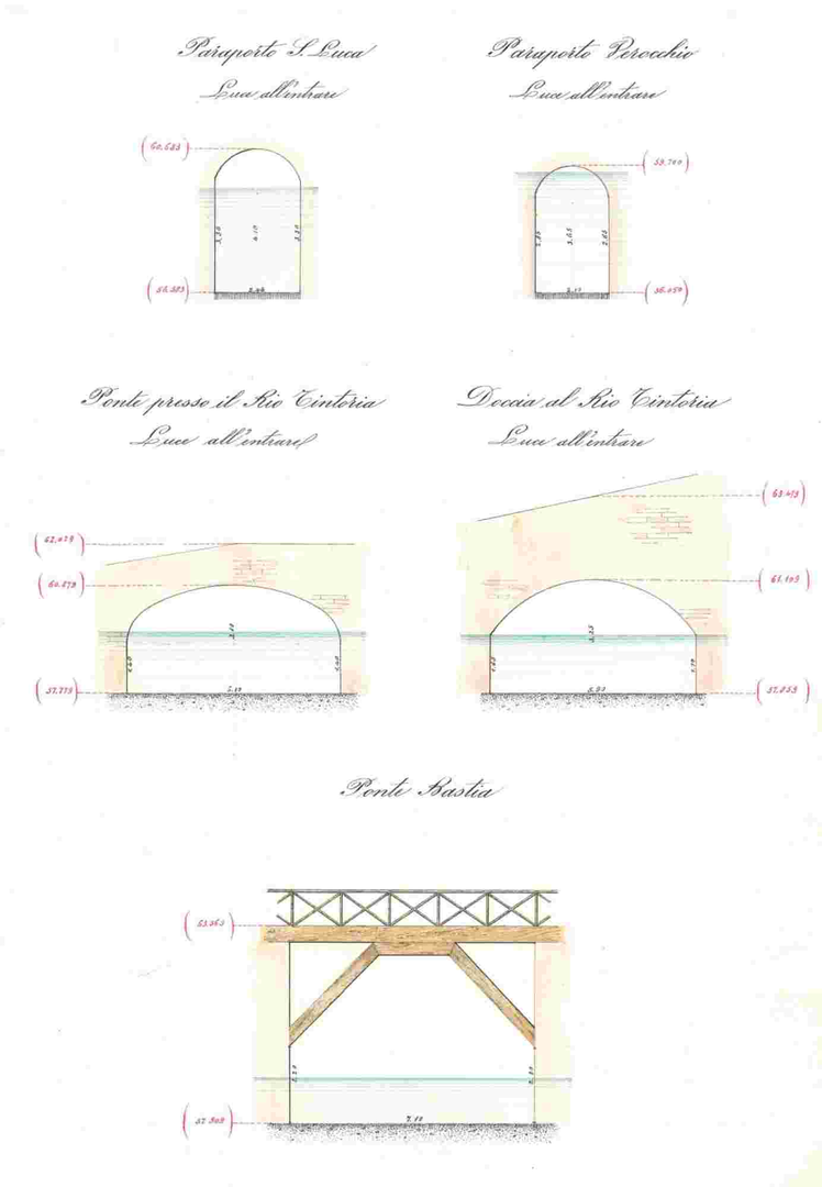 Sezione di vari manufatti tra cui il Ponte Bastia. Tavola realizzata dall'Ing. Saccenti, anno 1903, Archivio Consorzio Canali di Bologna