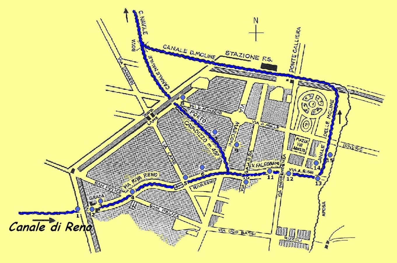 Alla Chiusa di Casalecchio si diparte il canale di Reno sulla riva destra del fiume Reno, mantenendosi in alto mediante un forte muro di contenimento fino alla Canonica dove scorre a cielo aperto oltre il Ghisello e la Certosa. A poca distanza inizia il suo percorso sotterraneo fino alla Grada, dove è stato riaperto un brevissimo tratto per lasciare in mostra il varco nelle mura con l’antica grata. Entrando in città percorre la via Riva di Reno. All’incrocio con via Marconi si diparte la derivazione del Cavaticcio che alimenta l’omonima Centrale Idroelettrica. Prosegue quindi il suo corso fino a via Falegnami, attraversa via Indipendenza e torna visibile dagli affacci di via Malcontenti, via Piella e via Oberdan, dove ritorna ad essere tombato. Piega ad angolo retto costeggiando via Capo di Lucca e via del Pallone dove piega nuovamente seguendo le antiche mura sotto l’Autostazione delle Corriere. Dopo aver ricevuto le acque del canale Moline - Aposa e del canale Cavaticcio dà origine al Canale Navile presso la Bova.