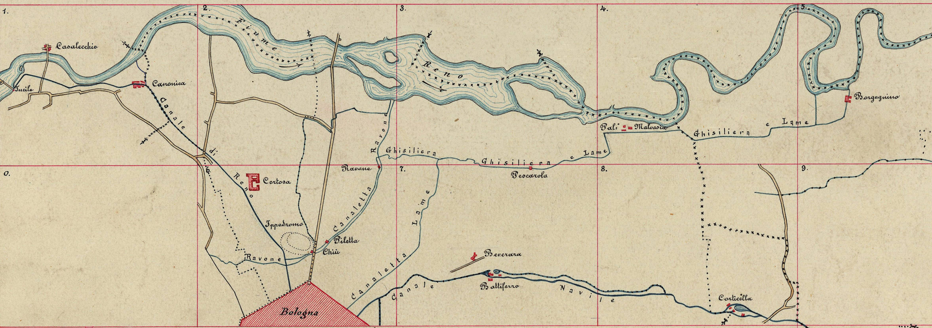 La Canaletta Ghisiliera è una derivazione del Canale di Reno che attraversa una vasta area a Nord Ovest di Bologna, interessando i territori di Bertalia e del Trebbo, per confluire nel fiume Reno dopo km 10,43. Il nome deriva dalla famiglia Ghisilieri, proprietaria di terreni agricoli fuori Porta San Felice. Il punto di derivazione , non più visibile dopo la copertura del Canale di Reno lungo via Sabotino, si trovava presso l’antico Ponte degli Stecchi, a monte dell’intersezione del torrente Ravone con il Canale di Reno. I tracciati della Ghisiliera e del Ravone si sviluppano paralleli verso Nord prima di sottopassare la via Emilia, nel punto ove si trovava l’Osteria del Chiù , per proseguire verso Ovest affiancando via del Chiù (fig. 1).