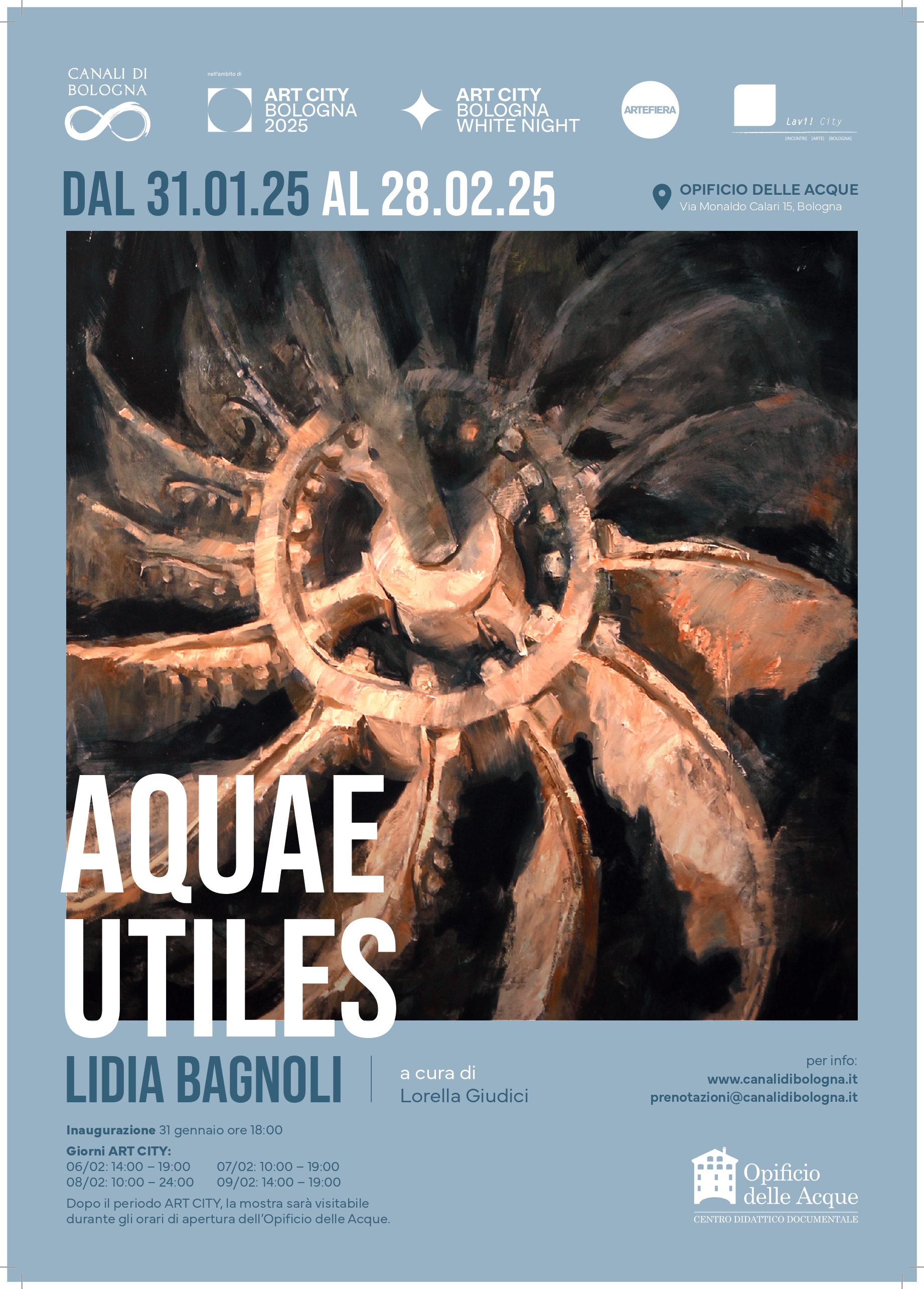 Canali di Bologna, in collaborazione con l’associazione culturale Spazio LAVì!, è lieta di presentare il progetto "AQUAE UTILES", che vedrà protagonista l’artista bolognese Lidia Bagnoli. La mostra, da una idea di Milena Naldi e Monica Manfrini e curata da Lorella Giudici, sarà ospitata presso l’Opificio delle Acque Centro Didattico - Documentale e quartier generale dei Canali di Bologna, dal 31 gennaio al 28 febbraio 2025.