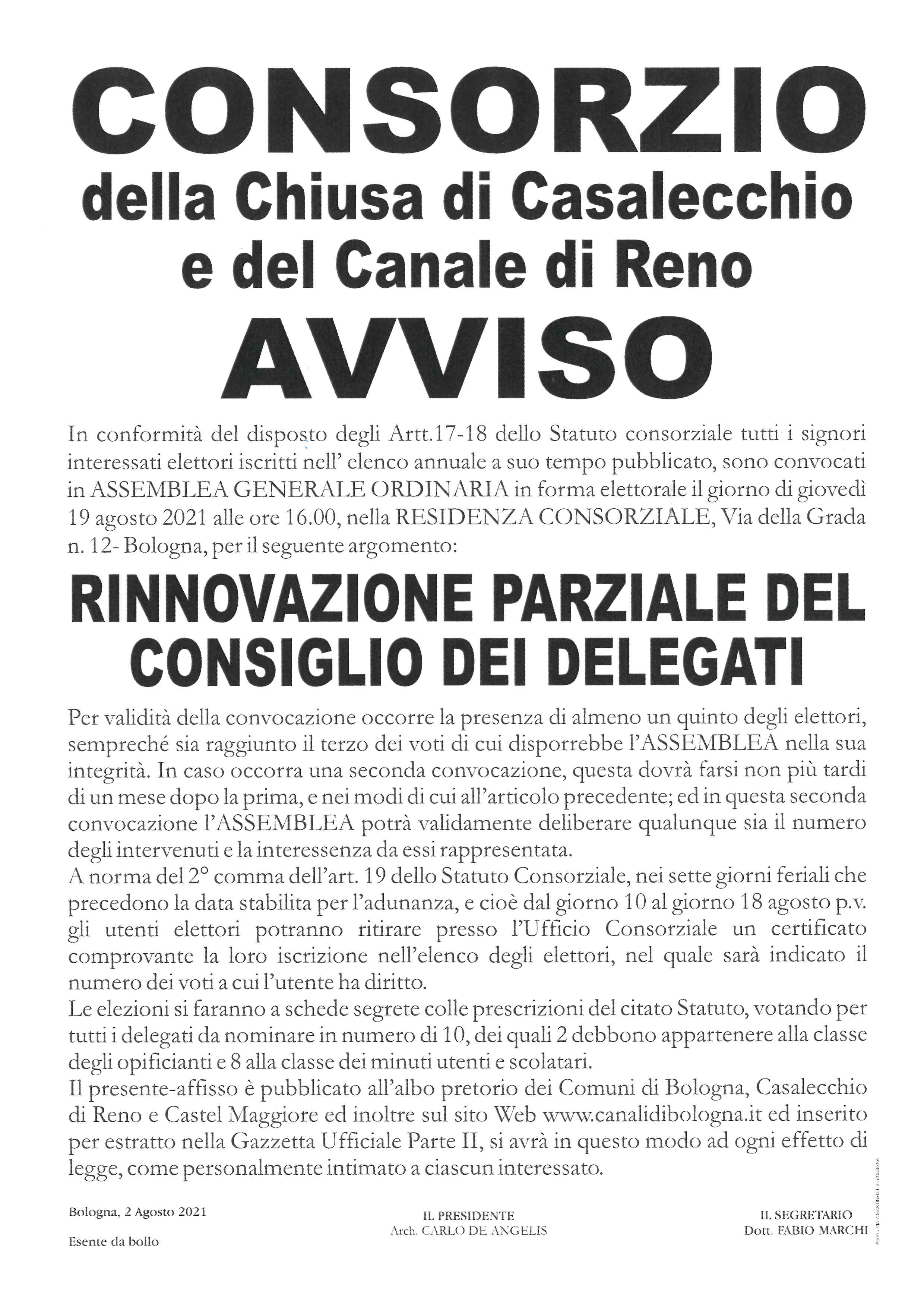 In conformità del disposto degli art. 17-18 dello statuto del Consorzio della Chiusa di Casalecchio e del Canale di Reno tutti i signori interessati elettori iscritti nell'elenco annuale a suo tempo pubblicato, sono convocati in Assemblea Generale Ordinaria in forma elettorale in data giovedì 19 agosto alle ore 16:00 presso la sede del Consorzio, in via della Grada, 12 - Bologna per il seguente argomento: