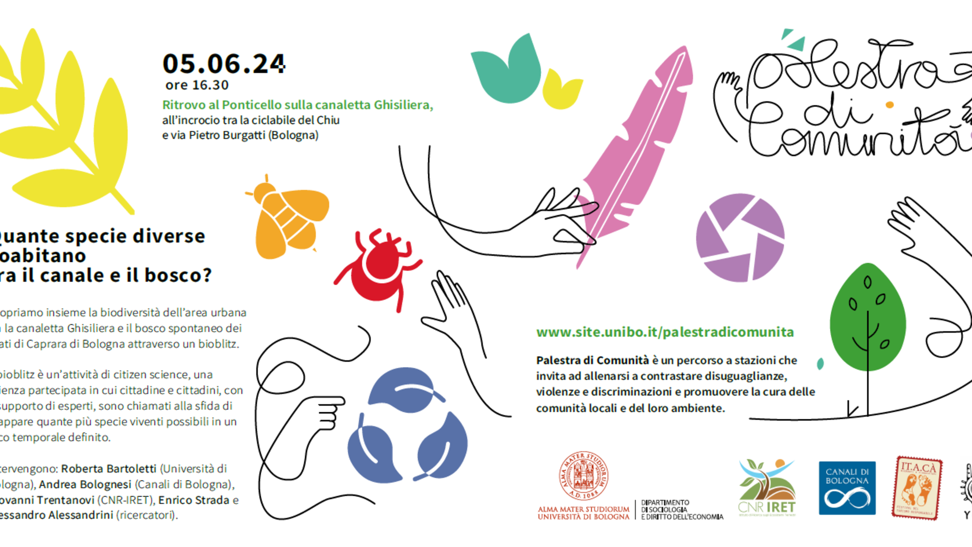 Mercoledì 05 giugno alle ore 16:30 appuntamento al Ponticello sulla canaletta Ghisiliera, all’incrocio tra la ciclabile del Chiu e via Pietro Burgatti per scoprire insieme la biodiversità dell’area urbana tra la canaletta Ghisiliera e il bosco spontaneo dei Prati di Caprara di Bologna attraverso un bioblitz.