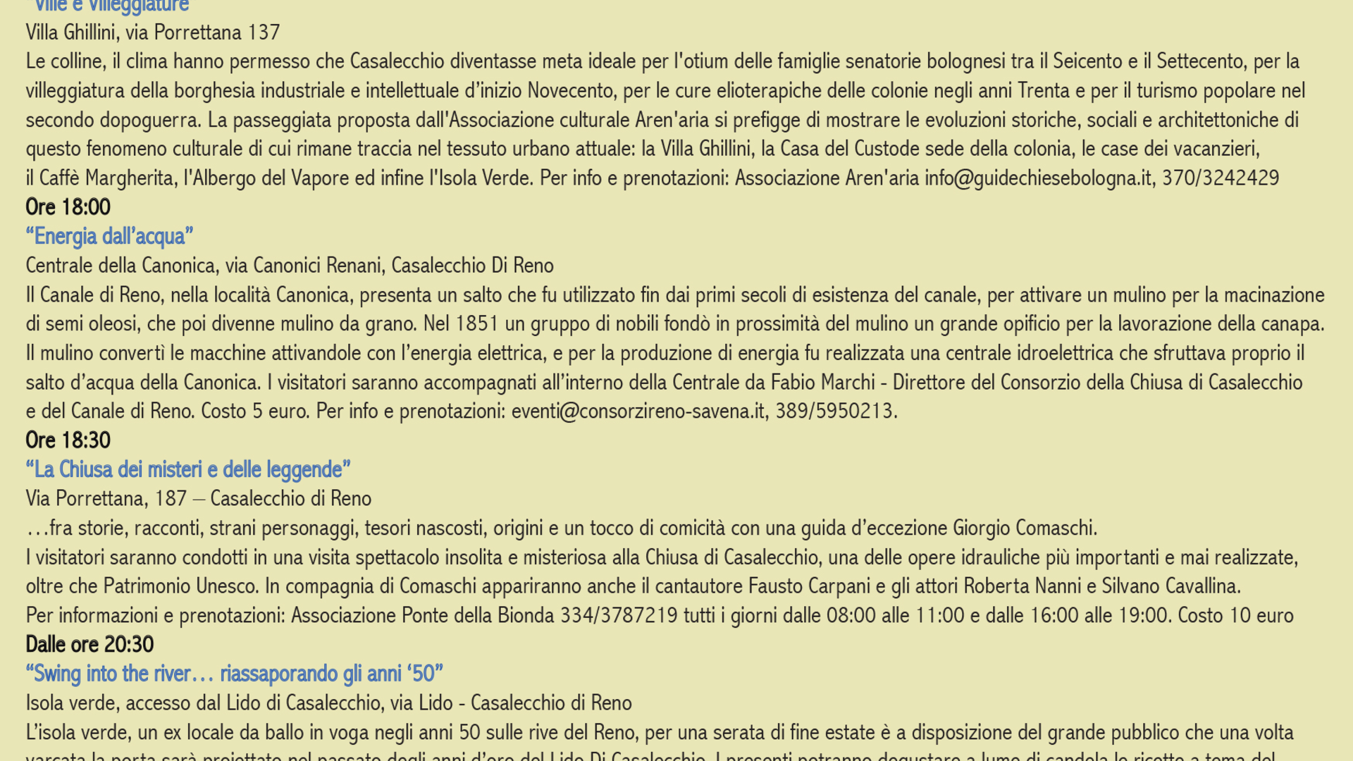 Visite guidate, spettacoli, concerti, e degustazioni vi accompagneranno in questa frizzante giornata di fine estate. Gli eventi in programma hanno come protagonista l’acqua, con lo scopo di salvaguardare e promuovere il patrimonio idrico di Casalecchio che opera a favore dell’intero territorio bolognese.