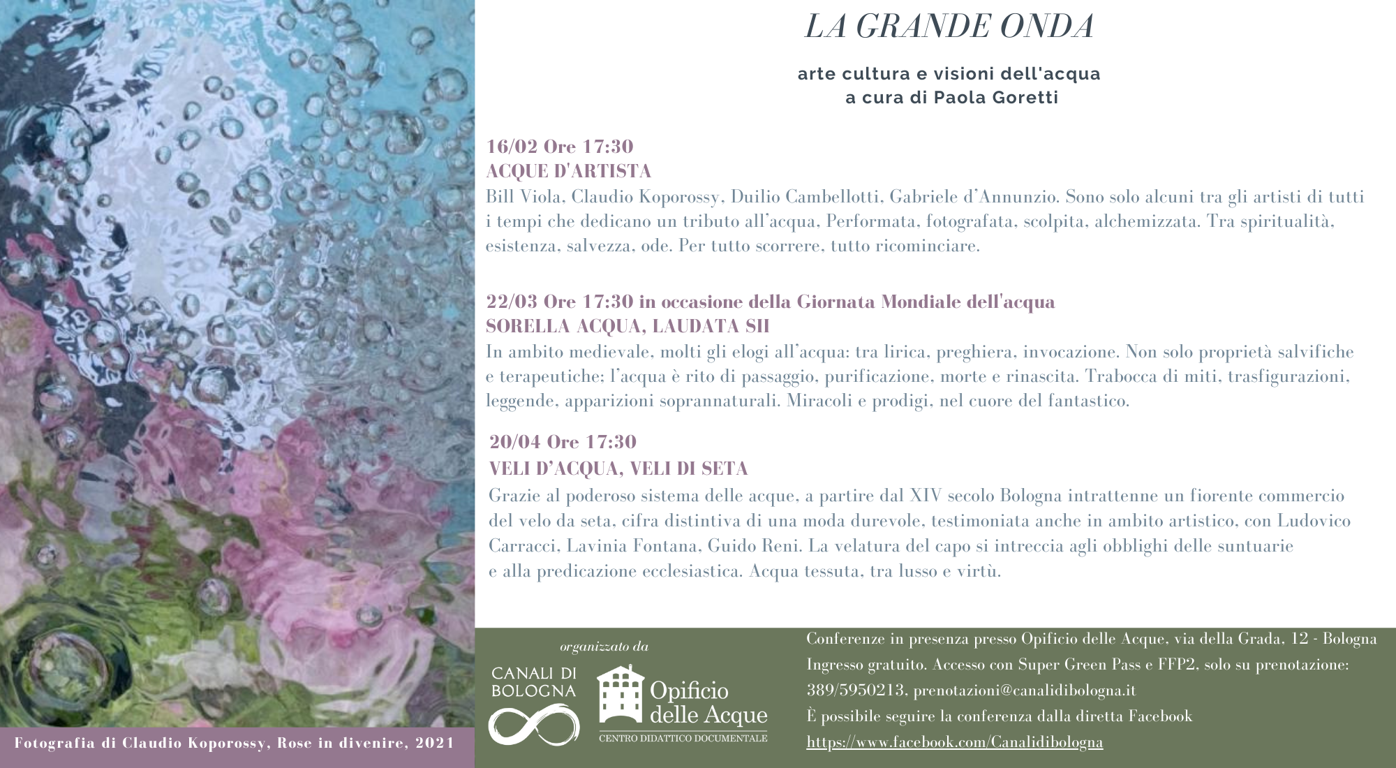 L’Opificio delle Acque, con la collaborazione di Canali di Bologna, promuove un nuovo ciclo di incontri denominato “LA GRANDE ONDA” dedicato all'arte, alla cultura e alle visioni dell'acqua e a cura della storica dell’arte Paola Goretti.
