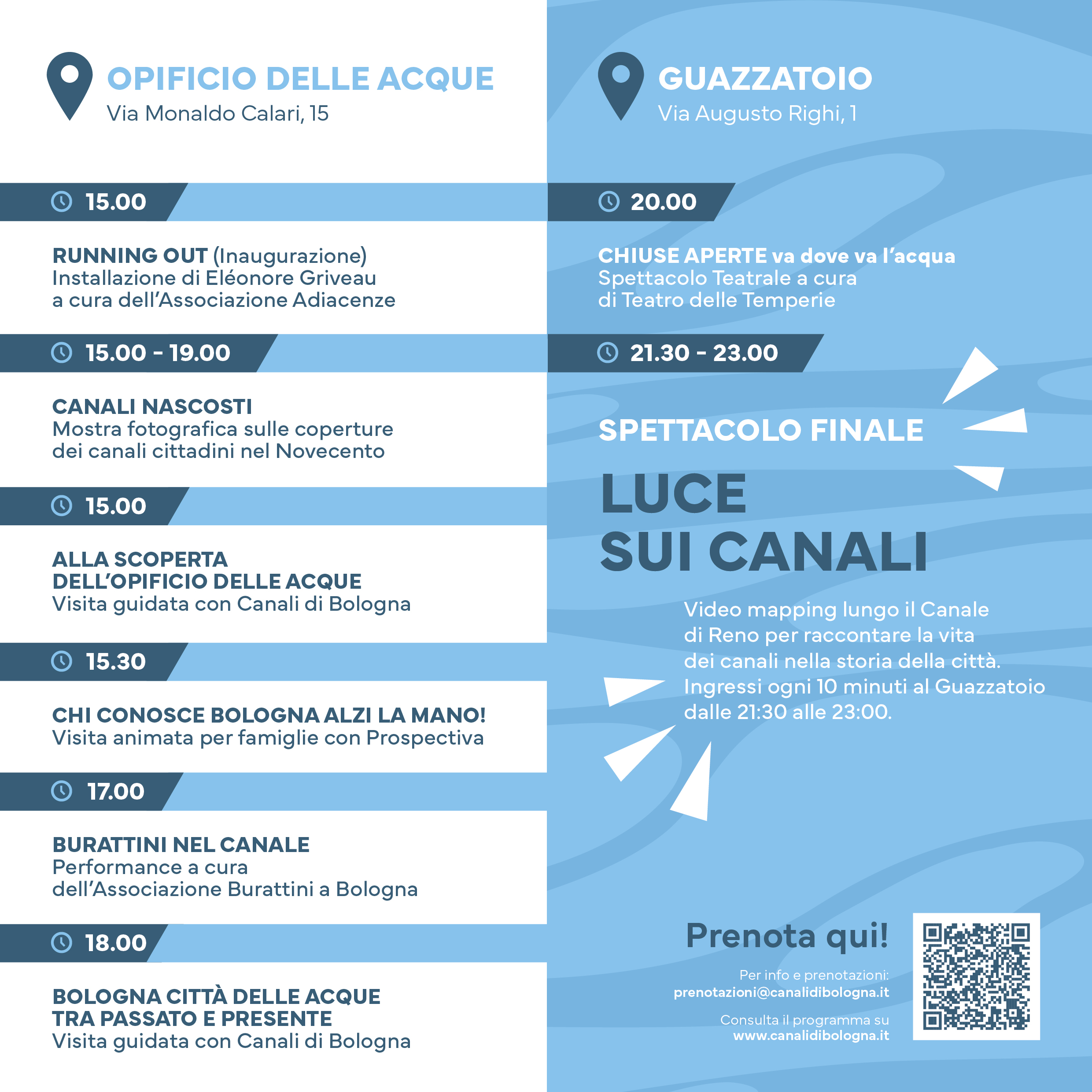 L’evento si concluderà con “Luci sul canale” uno spettacolo di videomapping lungo il canale Reno per raccontare la vita dei canali nella storia della città.