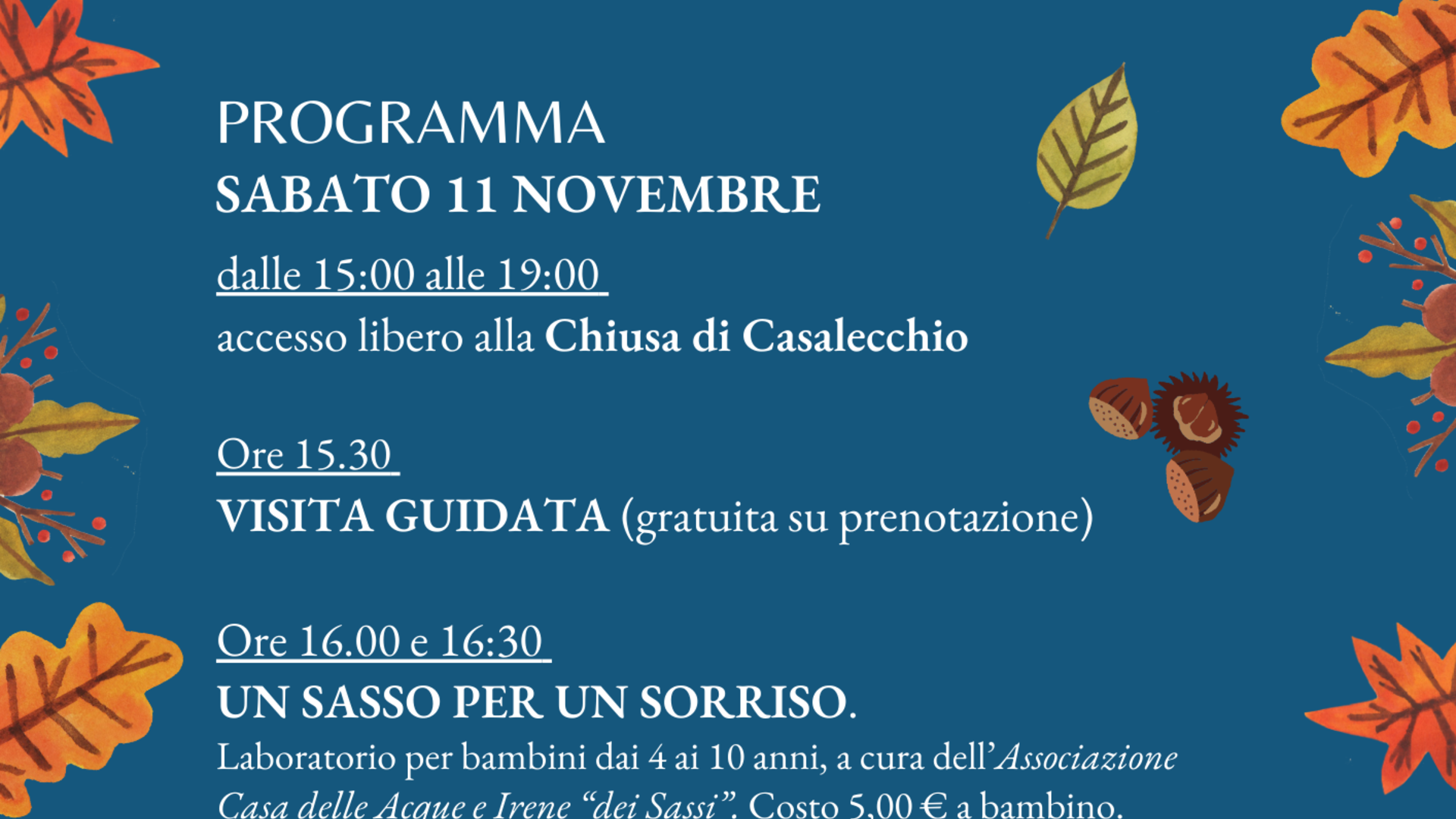 ore 16:00 e 16:30 UN SASSO PER UN SORRISO. Laboratorio per bambini dai 4 ai 10 anni, a cura dell’Associazione Casa delle Acque e Irene “dei Sassi (Per prenotare: https://prenota.canalidibologna.it ). Costo 5,00 € a bambino. Obbligatoria la presenza di un adulto.